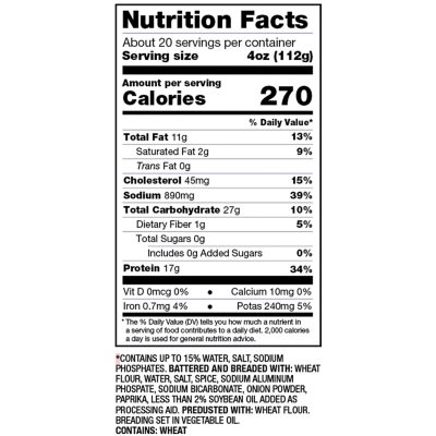 Rinse chicken tenders under cold running water and wash off any ice. Culvers are better tasting but the wait and consistency are not as good. 230 calories 14 g fat 3 g saturated fat 420 mg sodium 16 g carbs 0 g fiber 1 g sugar 10 g protein.